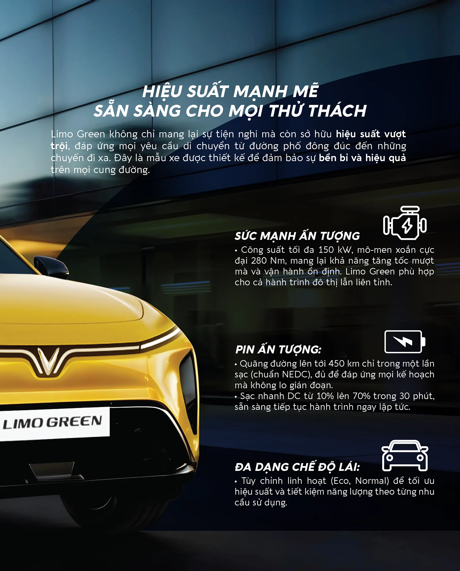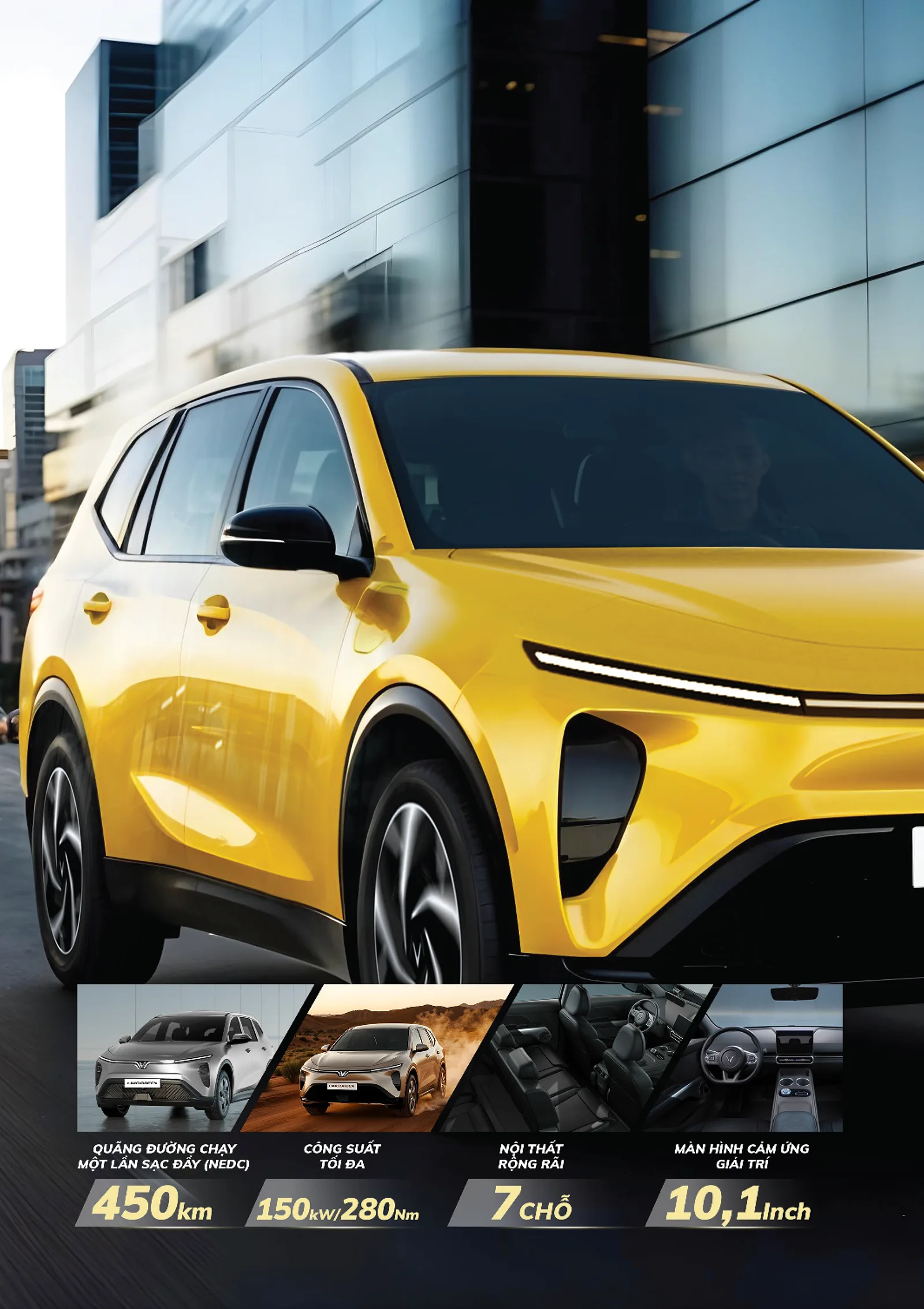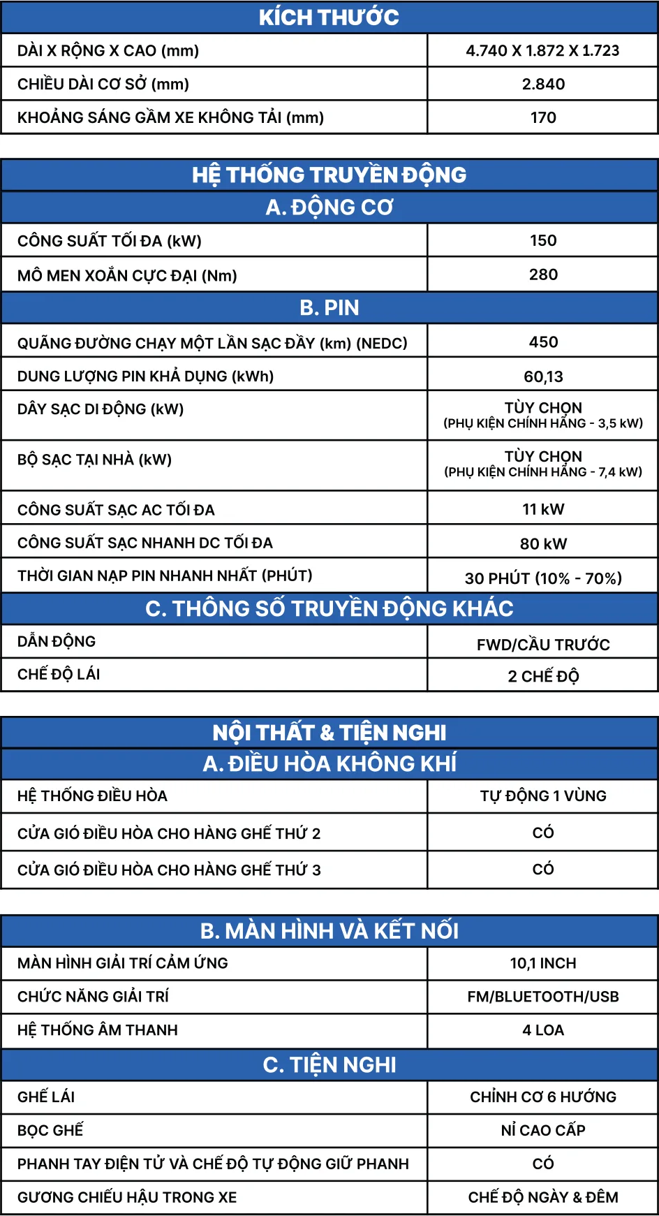 Thông số nổi bật Dài x rộng x Cao (mm): 4740 x 1872 x 1728 Chiều dài cơ sở: 2840 mm Khoảng sáng gầm xe: 170 mm Công suất tối đa: 150 kW Mô men xoắn cực đại: 280 Nm Quãng đường chạy (NEDC): 450 km/lần sạc đầy Dung lượng pin khả dụng: 60,13 kWh Công suất sạc nhanh DC tối đa: 80 kW Thời gian nạp pin nhanh nhất (phút): 30 phút (10%-70%) Dẫn động: FWD/Cầu trước Chế độ lái: Eco/Comfort/Sport Kích thước la-zăng: 18 inch Hệ thống treo (trước/sau): MacPherson/Đa liên kết Hệ thống phanh (trước/sau): Đĩa thông gió/Đĩa Đèn chiếu sáng phía trước: LED Đóng/mở cốp sau: Chỉnh cơ Hệ thống điều hòa: Tự động 1 vùng Màn hình giải trí cảm ứng: 10,1 inch Hệ thống loa: 4 loa Ghế lái: Chỉnh cơ 6 hướng