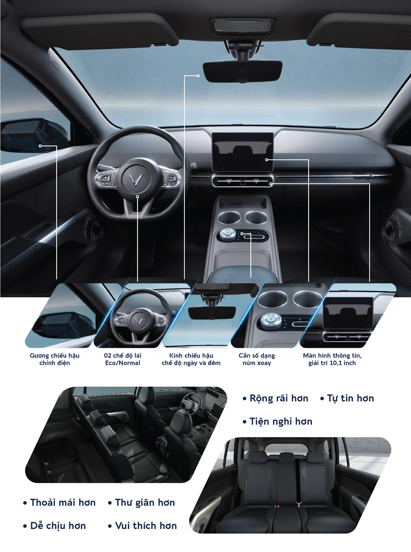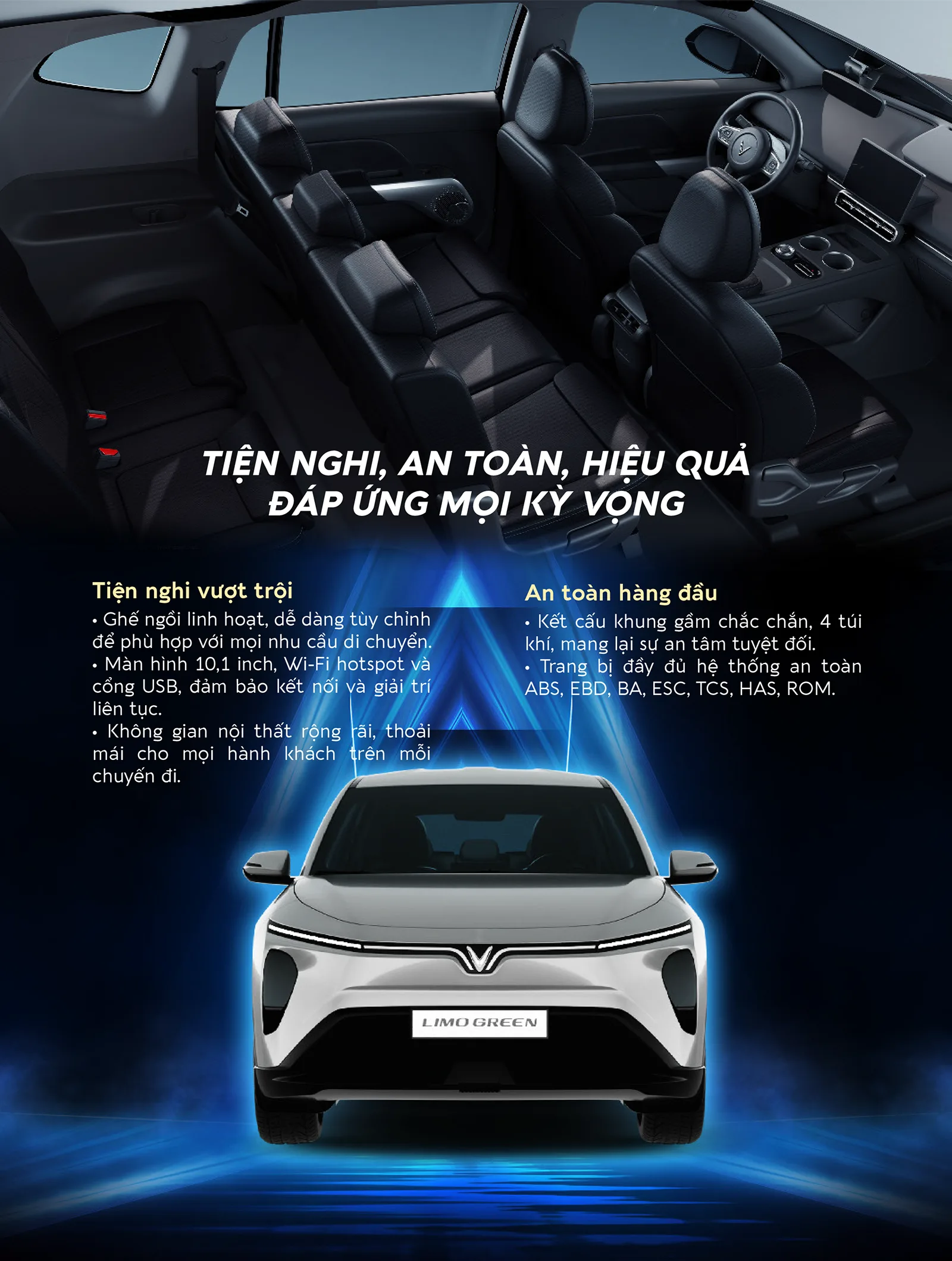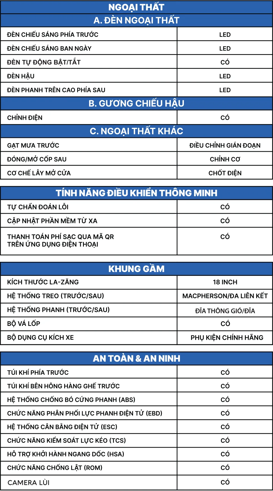 Thông số nổi bật Dài x rộng x Cao (mm): 4740 x 1872 x 1728 Chiều dài cơ sở: 2840 mm Khoảng sáng gầm xe: 170 mm Công suất tối đa: 150 kW Mô men xoắn cực đại: 280 Nm Quãng đường chạy (NEDC): 450 km/lần sạc đầy Dung lượng pin khả dụng: 60,13 kWh Công suất sạc nhanh DC tối đa: 80 kW Thời gian nạp pin nhanh nhất (phút): 30 phút (10%-70%) Dẫn động: FWD/Cầu trước Chế độ lái: Eco/Comfort/Sport Kích thước la-zăng: 18 inch Hệ thống treo (trước/sau): MacPherson/Đa liên kết Hệ thống phanh (trước/sau): Đĩa thông gió/Đĩa Đèn chiếu sáng phía trước: LED Đóng/mở cốp sau: Chỉnh cơ Hệ thống điều hòa: Tự động 1 vùng Màn hình giải trí cảm ứng: 10,1 inch Hệ thống loa: 4 loa Ghế lái: Chỉnh cơ 6 hướng